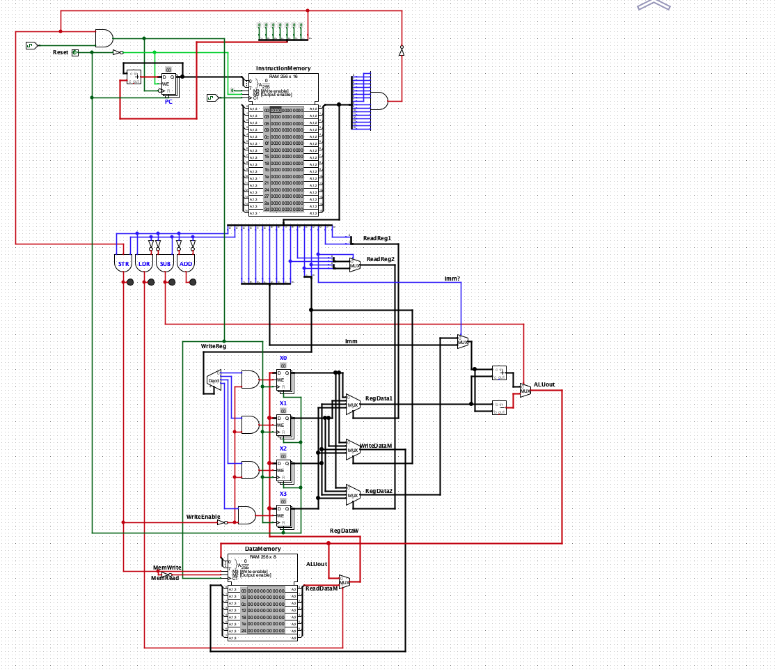 Architected using Logisim, featuring 4 registers, 3-read-ports, a datapath with an ALU, and separate instruction/data RAM.